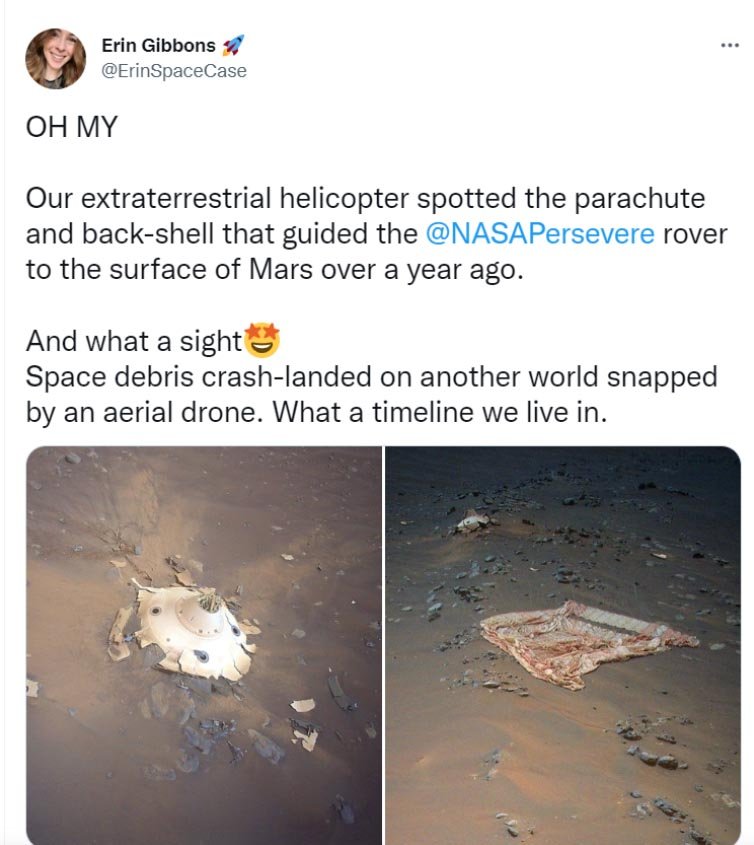 ഹാർഡ്വെയറുകളും നിഷ്ക്രിയ ബഹിരാകാശ പേടകങ്ങളും തകർന്ന ബഹിരാകാശ പേടകങ്ങളുമാണ് ഇവയിൽ പ്രധാന മൂന്ന് പാഴ്വസ്തുക്കൾ. പാരച്യൂട്ടും ബാക്ക് ഷെല്ലും ഉപരിതലത്തിൽ കിടക്കുന്ന ചിത്രവും പുറത്തു വിട്ടു.