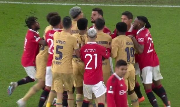 യൂറോപ്പ ലീഗിലെ ബാഴ്സലോണ – മാഞ്ചെസ്റ്റര് യുണൈറ്റഡ് മത്സരത്തിനിടെ കോർട്ടിൽ തല്ലുമാല. യുണൈറ്റഡ് താരം ബ്രൂണോ ഫെര്ണാണ്ടസ് നിലത്തു വീണ കളിക്കാരനു നേരെ ഷോട്ട് എടുത്തതാണ് പ്രകോപനം.